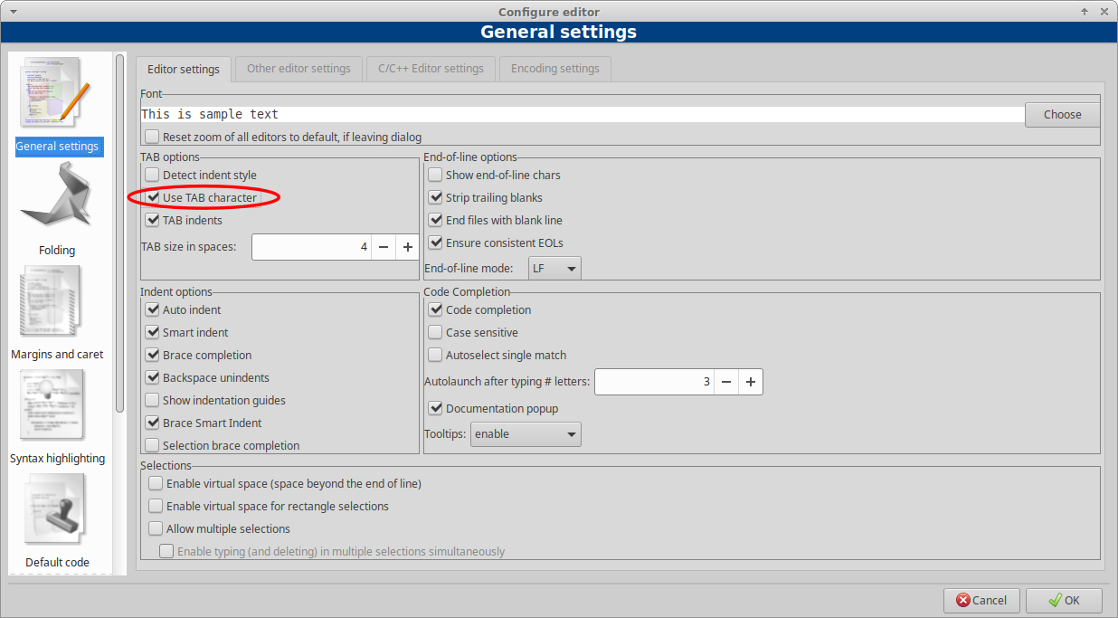 Before editing any files, remember that all code needs to comply with the doc_code_style_guidelines. One important difference with Redot is the use of tabs for indents. Therefore, the key default editor setting that needs to be changed in Code::Blocks is to enable tabs for indents. This setting can be found by selecting Settings > Editor.