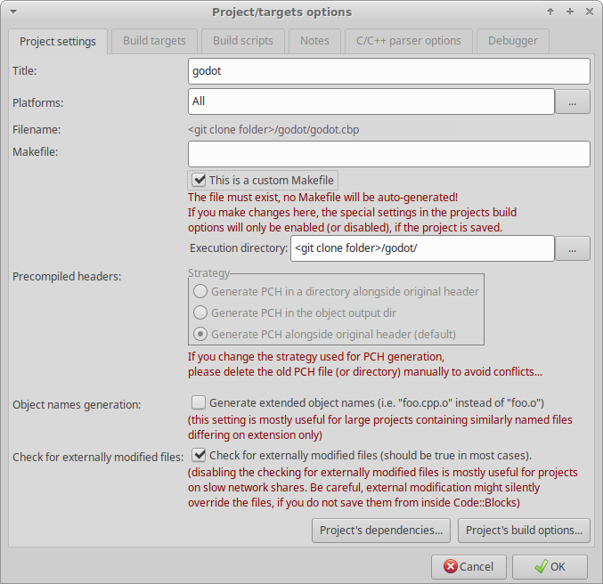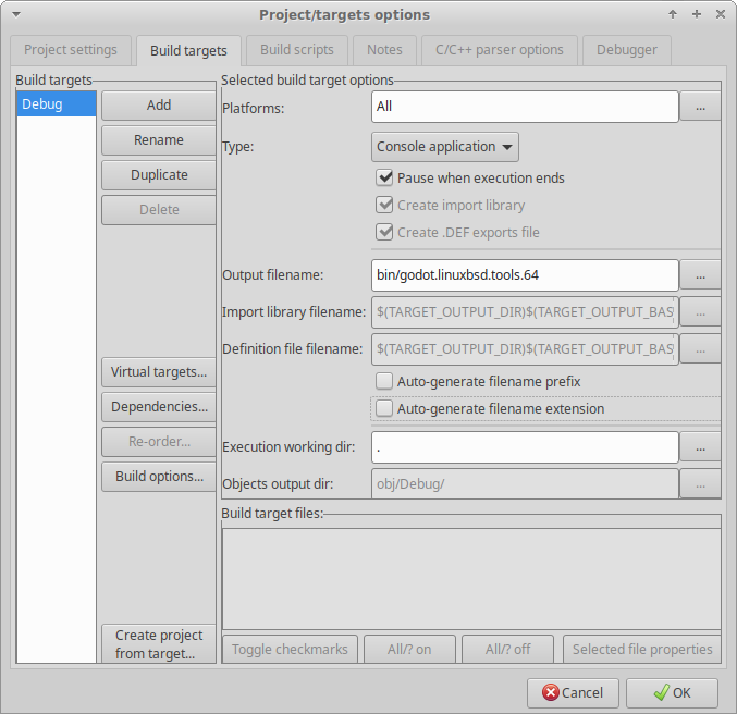 There are two additional points worth noting. First, if required, the Execution working dir field can be used to test specific projects, by setting it to the folder containing the project.Redot file. Second, the Build targets tab can be used to add and remove build targets for working with and creating different builds.
