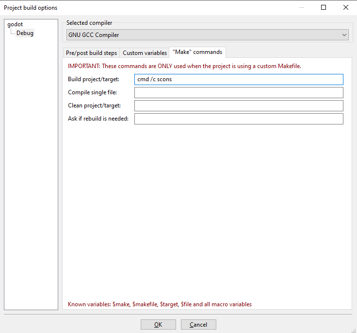 Select the "Make" commands tab and remove all the existing commands for all the build targets. For each build target enter the SCons command for creating the desired build in the Build project/target field. The minimum is scons. For details on the SCons build options, see doc_introduction_to_the_buildsystem. It's also useful to add the scons --clean command in the Clean project/target field to the project's default commands.